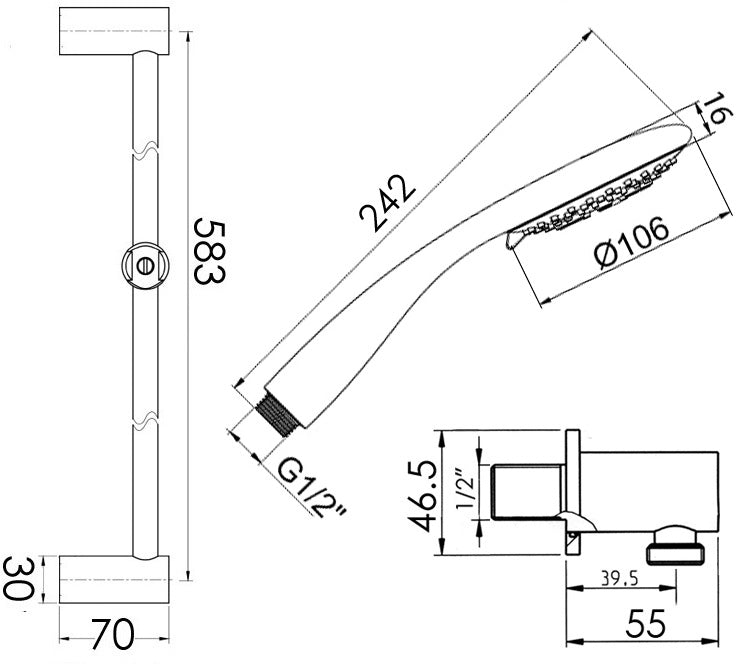 | Description | Consists of: Claro multi function ABS handset with white face and deluxe non-tangle hose, Techno wall outlet, and Techno 600mm slider bar |