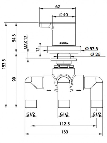 | Description | 2 x 1/2″ inlets, 2 x 1/2″ outlets Diverter body requires footprint of 130mm Height 52mm Base 57mm Plate size 25mm |