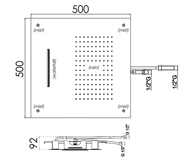 | Description | Requires minimum 3 bar pressure. Comes with mounting frame. Triple function: Rain 12.9 l/m Waterfall 17.1 l/m Spray mist 8.2 l/m Requires shower valve with 3 outlets |